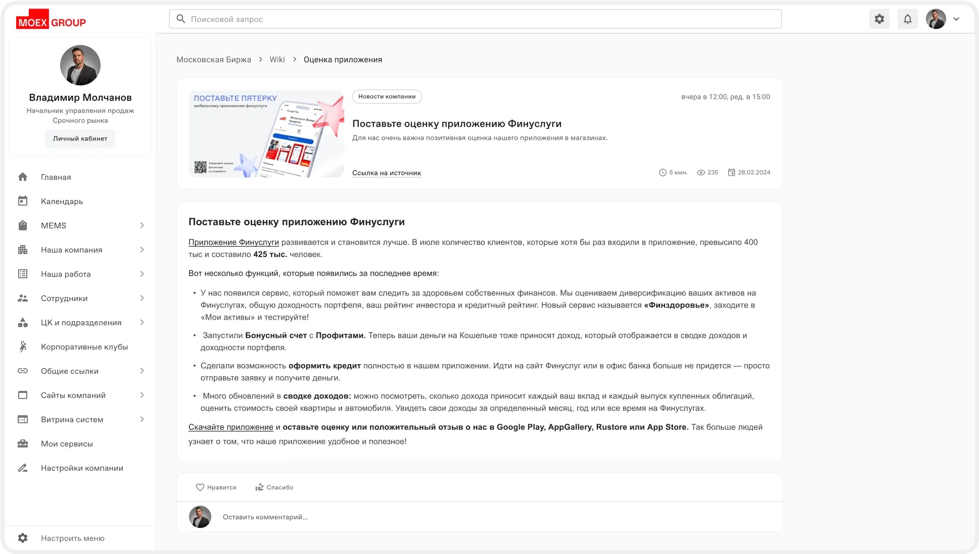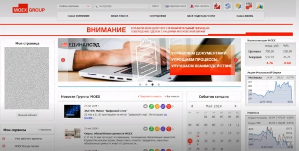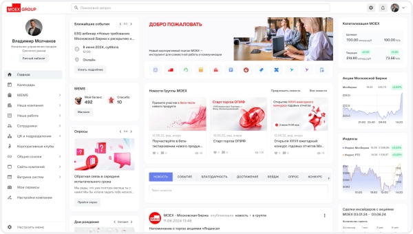 На главной странице портала важно было разместить всё, что нужно сотрудникам для повседневной работы. Под баннером были размещены ссылки на сервисы, которые сотрудники используют наиболее часто. Справа — биржевые графики с актуальными данными. В центре — виджет с последними новостями и внутренняя соцсеть, где сотруднки могут делиться своими публикациями.