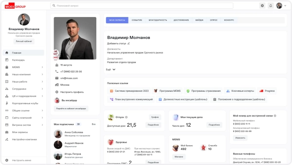 Совместно с командой мы переосмыслили структуру корпоративного портала. Внедрили внутреннюю социальную сеть с возможностью публикаций, комментирования и лайков, редактор новостей с ролями для авторов и модераторов, а также разделы для корпоративных сообществ и групп по интересам.