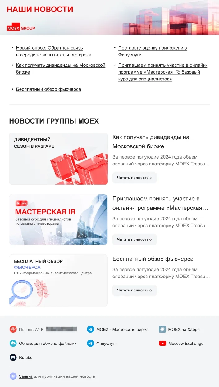 Задачей стала функция создания рассылок из портала. Администратор может формировать рассылку, выбирая контент из существующих публикаций, создавать новые новости или копировать материалы с других сервисов. Далее был выполнен редизайн дайджеста новостей и страницы просмотра конкретной новости.