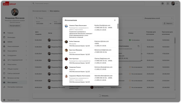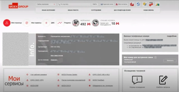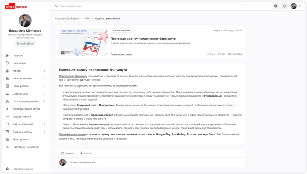 На главной странице портала важно было разместить всё, что нужно сотрудникам для повседневной работы. Под баннером были размещены ссылки на сервисы, которые сотрудники используют наиболее часто. Справа — биржевые графики с актуальными данными. В центре — виджет с последними новостями и внутренняя соцсеть, где сотруднки могут делиться своими публикациями.