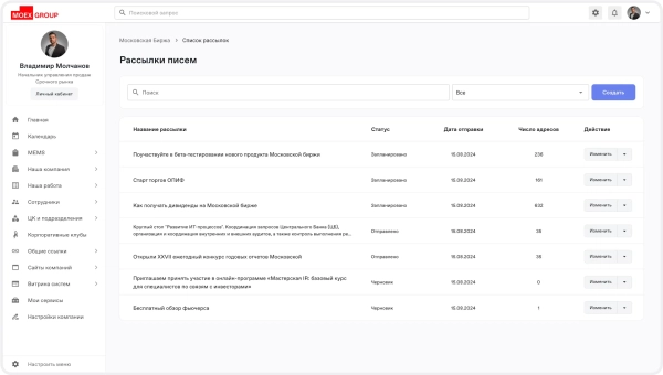 Задачей стала функция создания рассылок из портала. Администратор может формировать рассылку, выбирая контент из существующих публикаций, создавать новые новости или копировать материалы с других сервисов. Далее был выполнен редизайн дайджеста новостей и страницы просмотра конкретной новости.